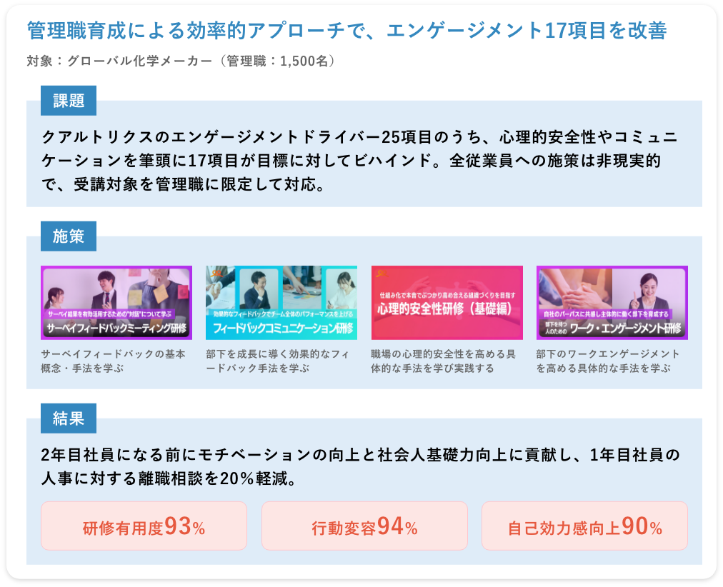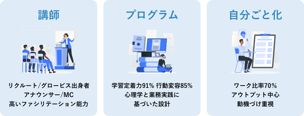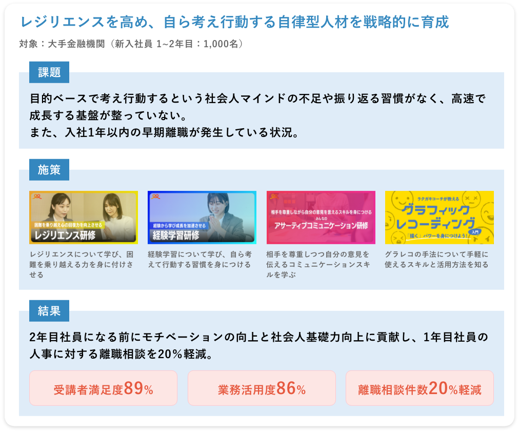 「新入社員研修」や「管理職研修」といった階層別の研修から「1on1研修」や「レジリエンス研修」、「心理的安全性研修」といったテーマ別の研修まで200種類以上の研修/ワークショップをご提供しています。